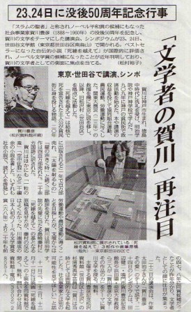 実はこれ、この度、今月23日、24日に世田谷文学館で開催予定の「賀川豊彦と文学~その作品の力~」の案内を見た同紙の松村裕子記者がお訪ね下さり、取材をして下さったものが本日載ったのである。