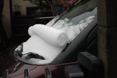 なんと昨晩降った雪が、朝になると程よくやわらかくなって、めくれ、しかもロール状になっているではないか!偶然、条件が重なってみられた瞬間的な自然芸術である。しかも、一件のみなならず、複数ある!!