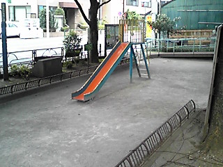 この滑り台の右奥に目を細めると、賀川胸像が見える。背景のトタンに色が同化してしまって見にくいが。