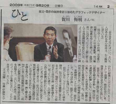 今年1909は賀川献身100年記念であるが、同時に太宰治生誕100年でもある。それゆえ文芸界から演劇界まで、各方面で太宰の話題が尽きない。賀川と太宰が生前交わりがあったかどうかは不明であるが、奇しくもご子孫の代では、新聞紙上で同じ号に顔写真入りで記事が掲載されている。このことには、不思議な縁を感じぜずにはおられない。