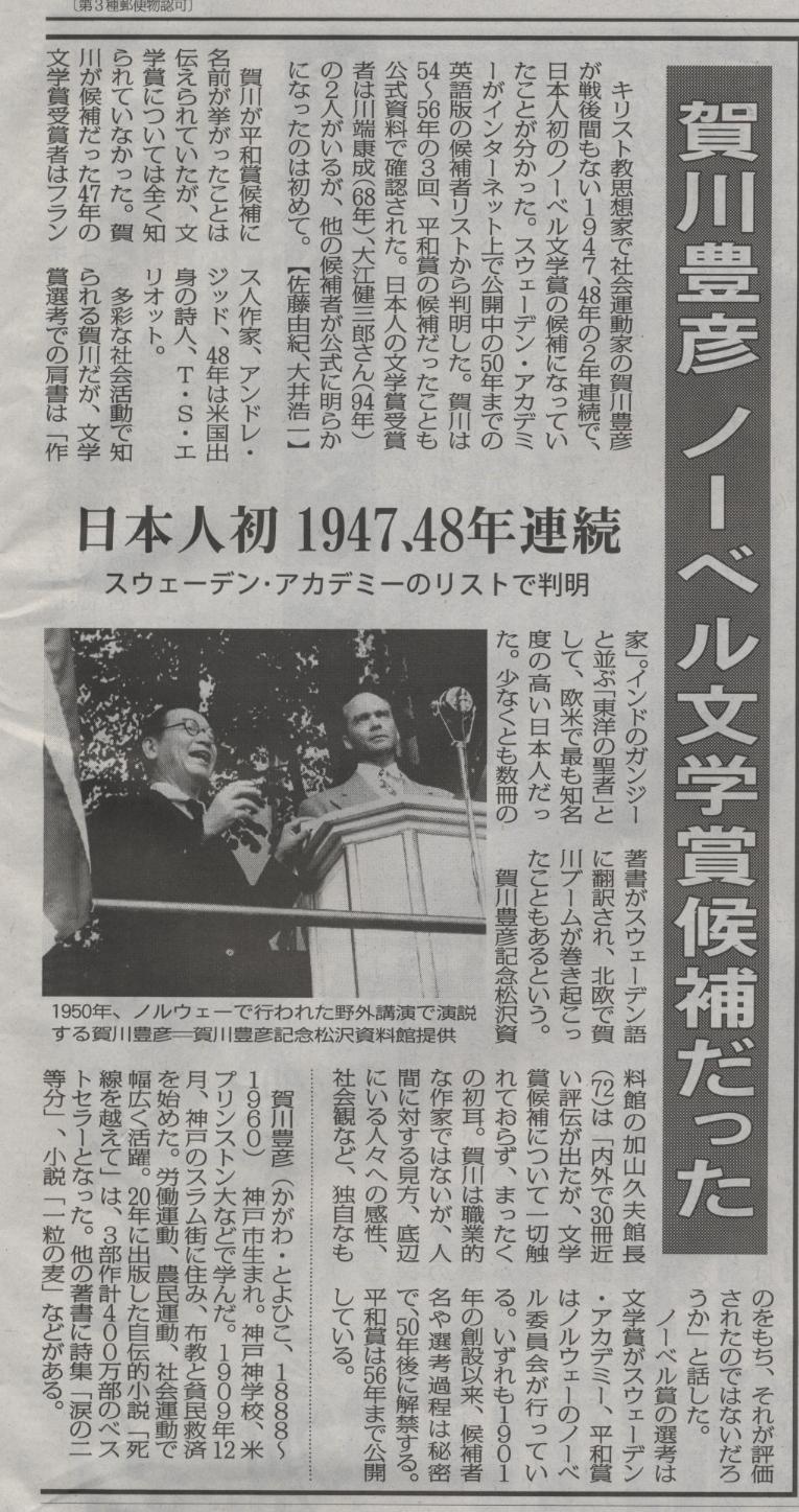 昨日、毎日新聞記者が突然来館され、館長と話がしたいと申された。どんな御用かと思いきや、なんと賀川豊彦はノーベル文学賞候補だったとおっしゃるのである。一目散に別室に行き、館長に電話連絡を入れ、そのまま記者の方に受話器に出て頂いた。経緯を詳しくお聞きし、翌日の朝刊に出ると知らされた。それが、9月13日(日)毎日朝刊のこの記事である。