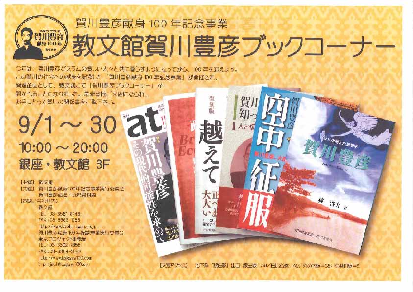 下段の写真は、賀川関係書籍の一覧である。今回は、当館より、原資料である、賀川の遺品も展示してある。もちろん雑芸員による展示!搬入が土曜日だったので、銀座の中心は交通規制(ホコ天)があり苦労した…。