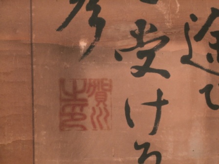 また、掛け軸の署名の後の落款が、所蔵している他の掛け軸のものと一致していることがある。上の写真は、収蔵している「下座奉仕」と書かれた、揮毫である。賀川の座右の銘ともいえる言葉である。人の手の届かないところを、お手伝いさせていただくことである。尻拭いといういい方もあるが、ようは相手に仕えることである。この掛け軸の落款が、話題の掛け軸のものと同一なのである。これはかなり根拠としては大きい。